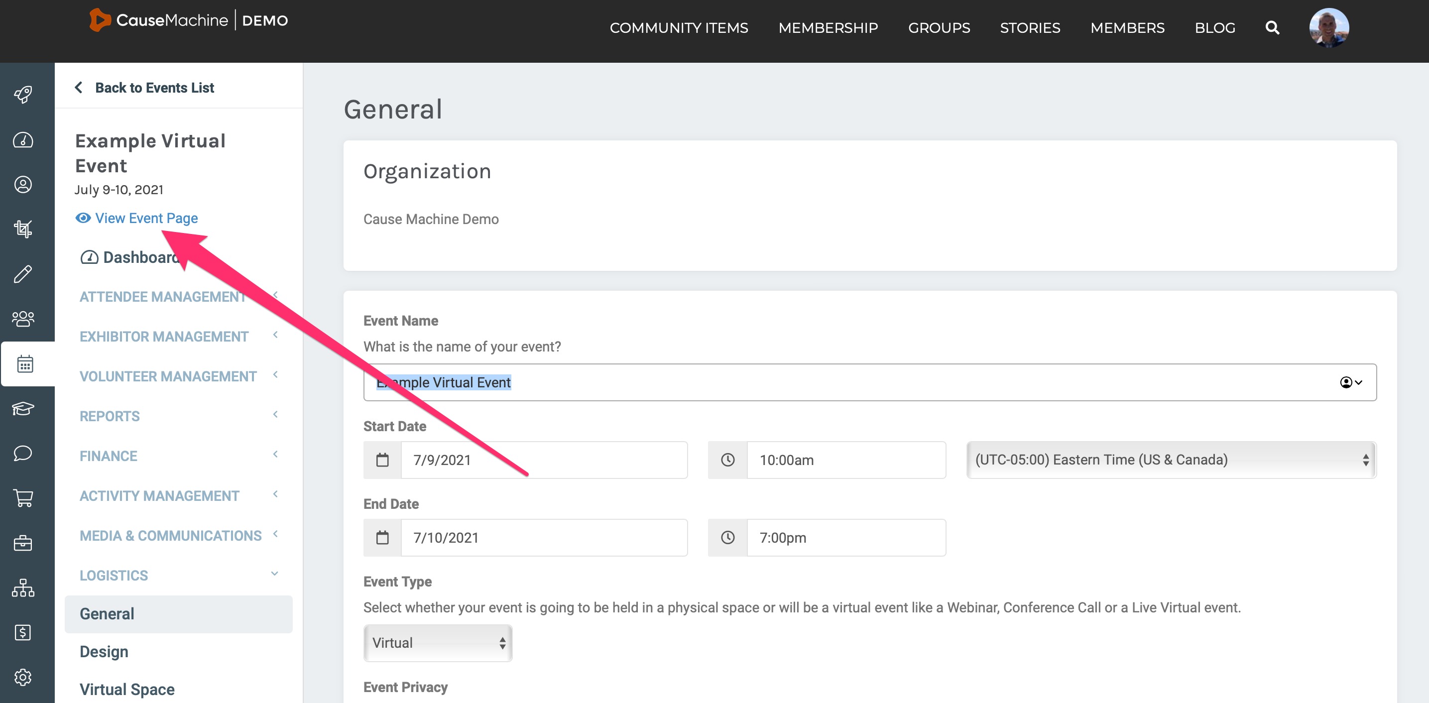 Here is the example event we are working from in this tutorial - https://demo.causemachine.com/events/example-virtual-event