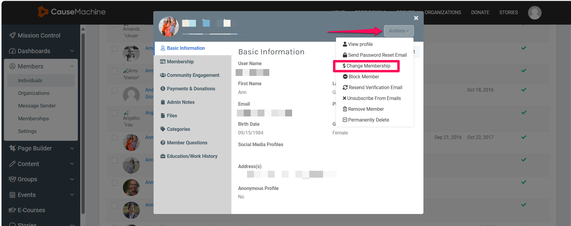 As a Community Admin, you can downgrade an Individual's membership level or an Organization's membership level. To do this, you will select that Individual or Organization from your Member Dashboard and click Actions in the upper right of their member card. Select Change Membership and select the membership level you would like to move them to. *NOTE* This can only work if you are downgrading a membership or moving within free membership levels. You CANNOT move a member to a plan that is more expensive.
