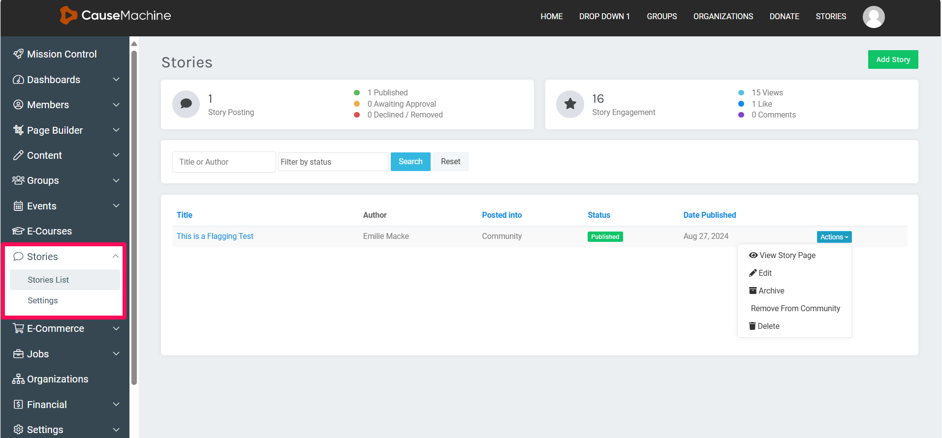 Stories are a powerful tool for members of your community to connect with one another. On the backend, a community can view the Stories Dashboard by selecting Stories>Stories List.
