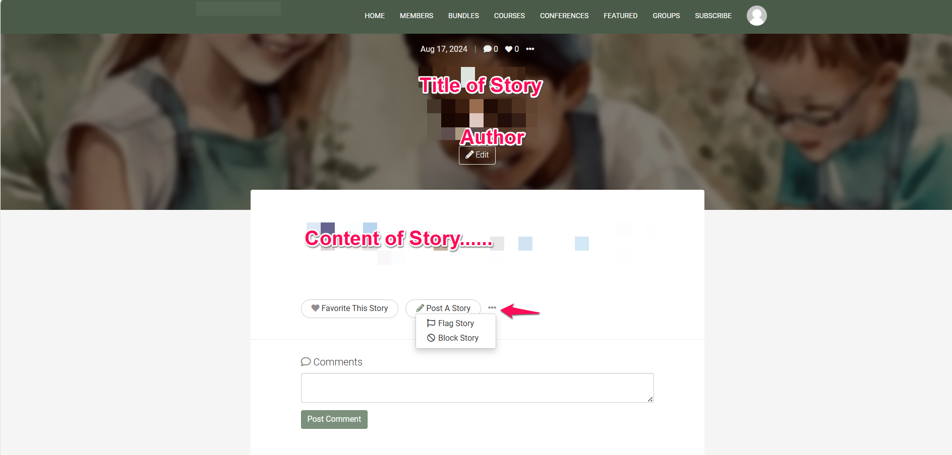 While viewing a Story, members have the ability to Favorite This Story, Post A Story, Flag Story or Block Story (options available when selecting the three dots), and Comment on the Story.