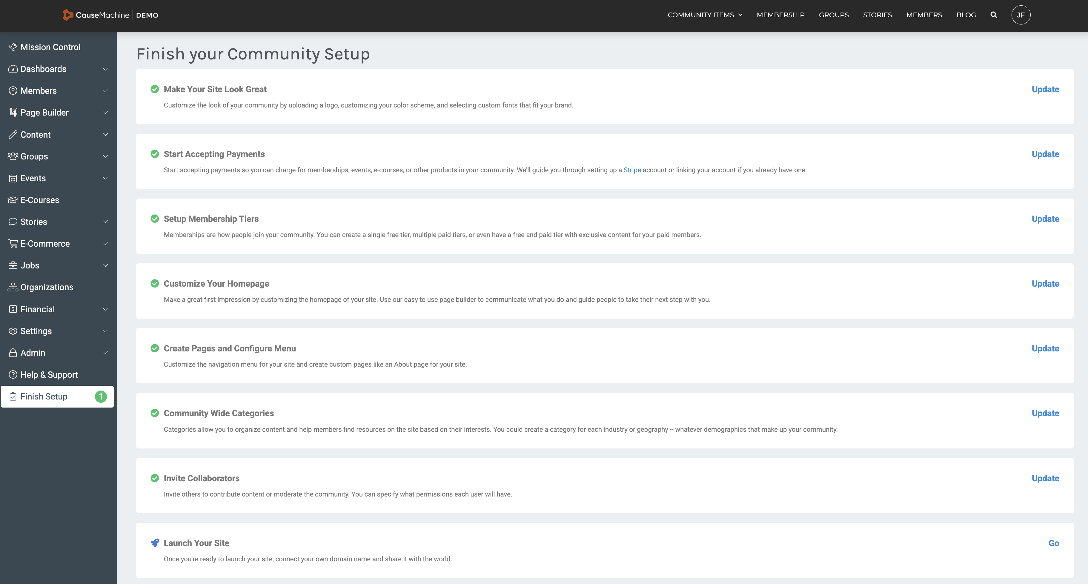 The Finish Your Community Setup page will appear with a checklist of items to complete:
