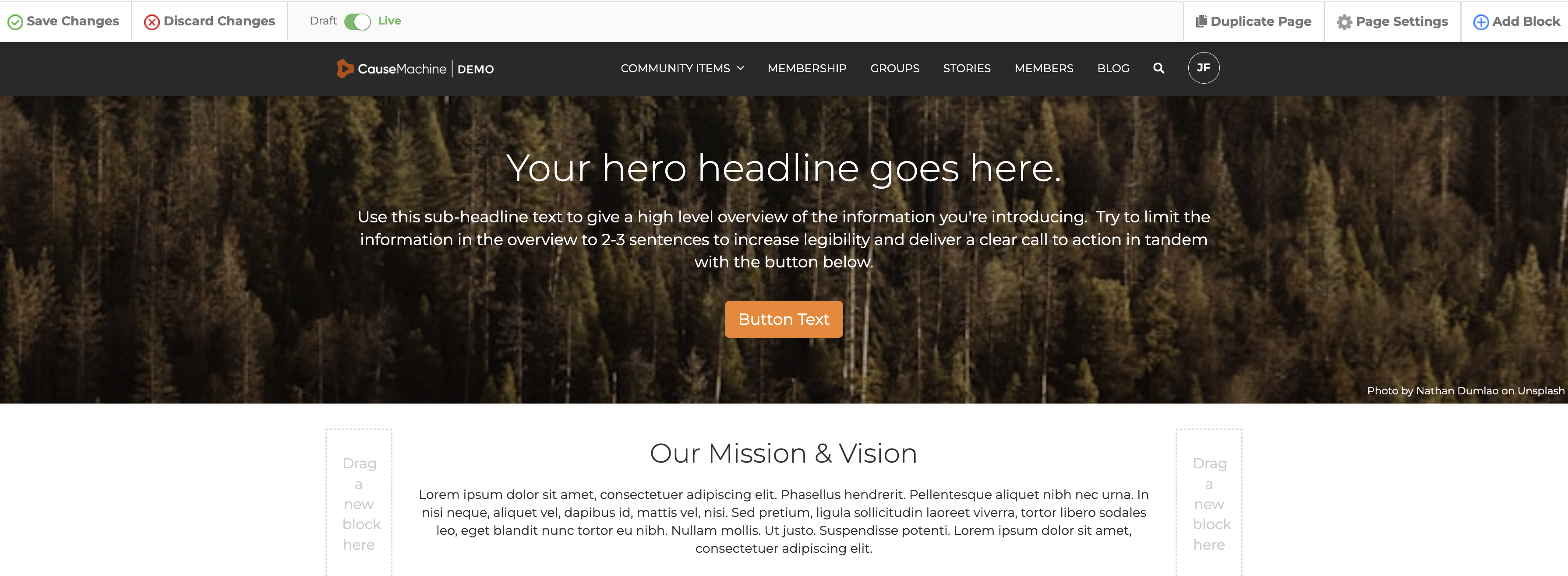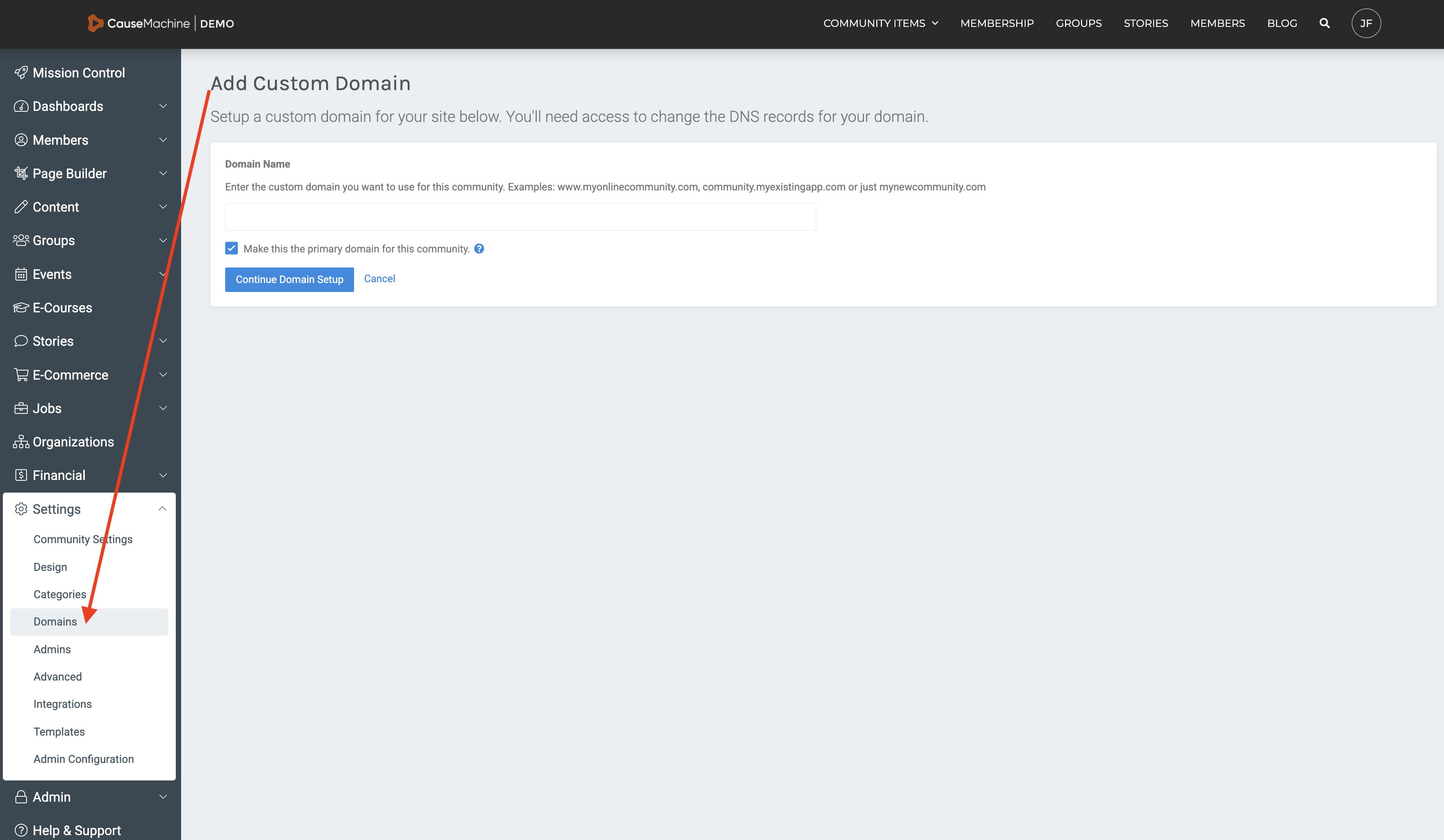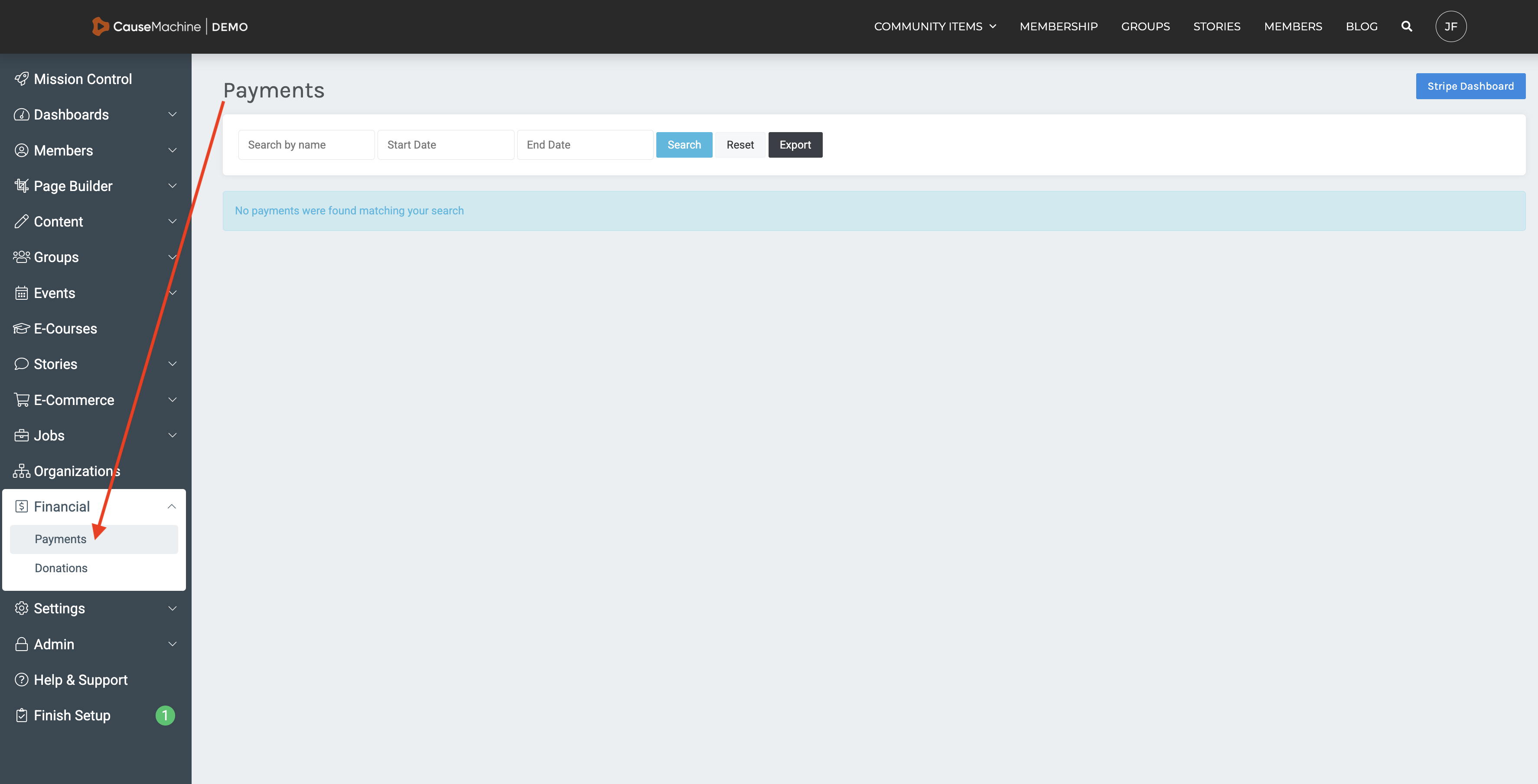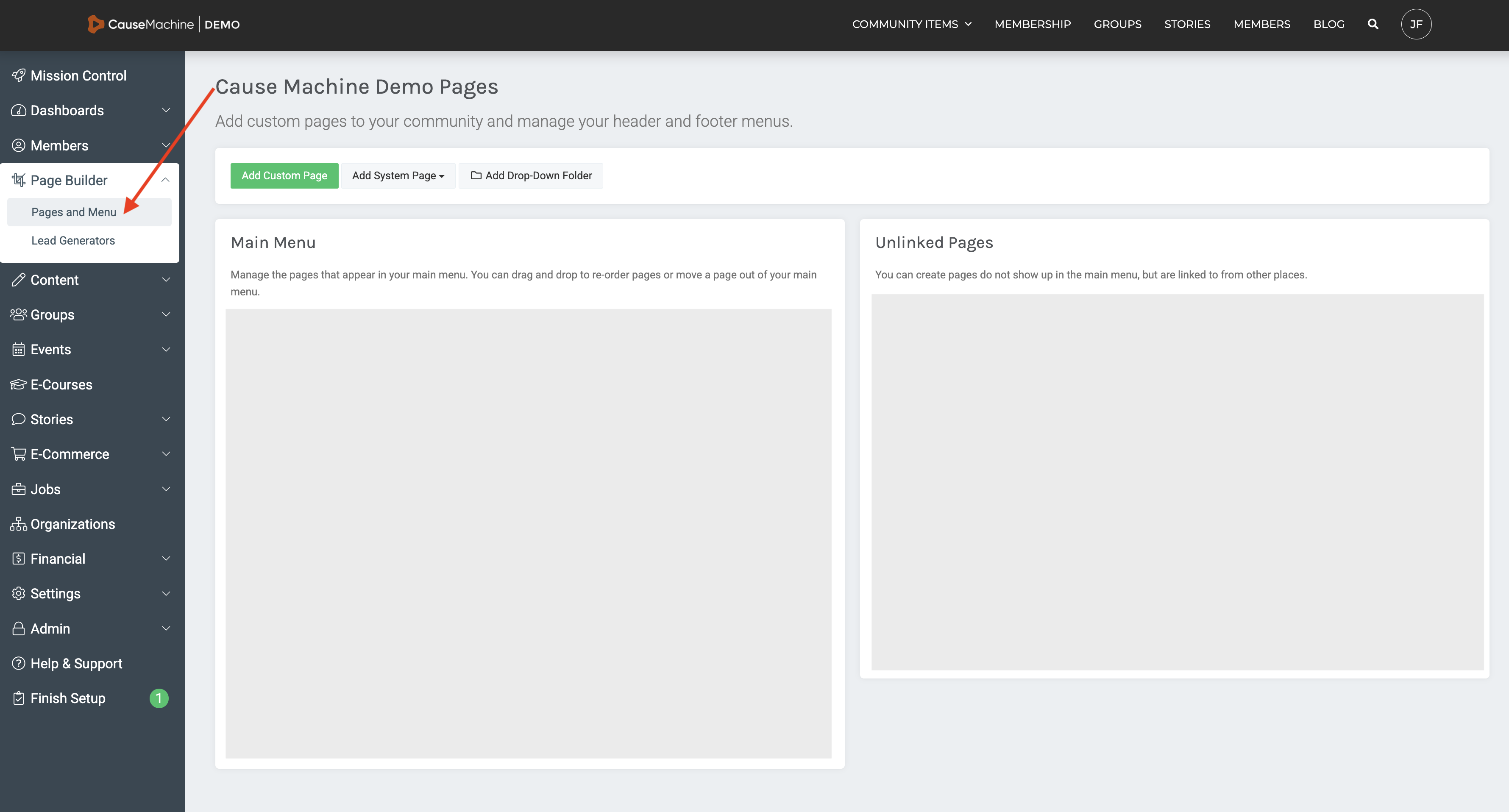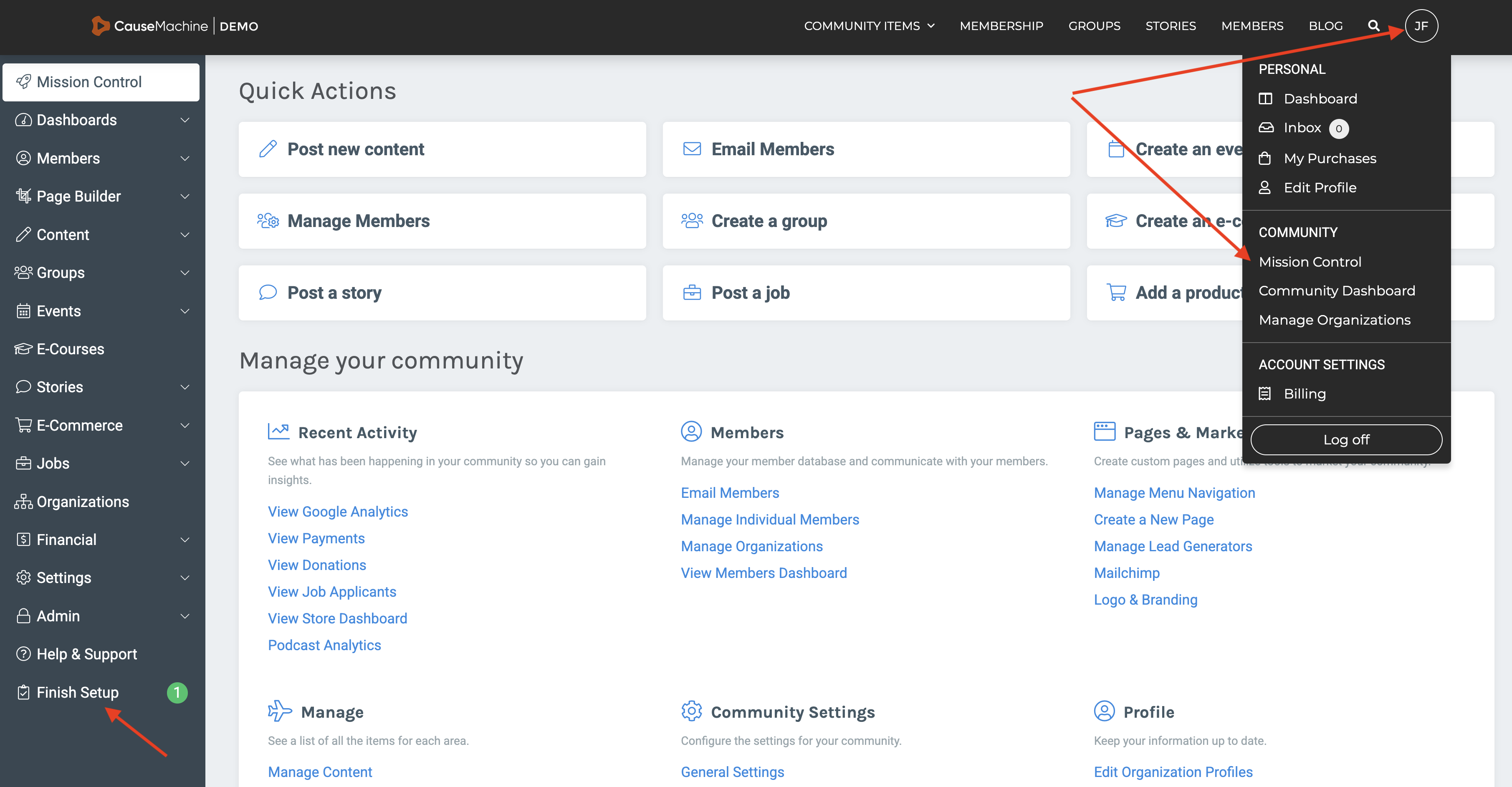Once you login to your Cause Machine account, click the profile icon in the top right corner. In the drop down menu, click "Mission Control" under Community. Click "Finish Setup" at the bottom of the left margin of your screen in Mission Control.