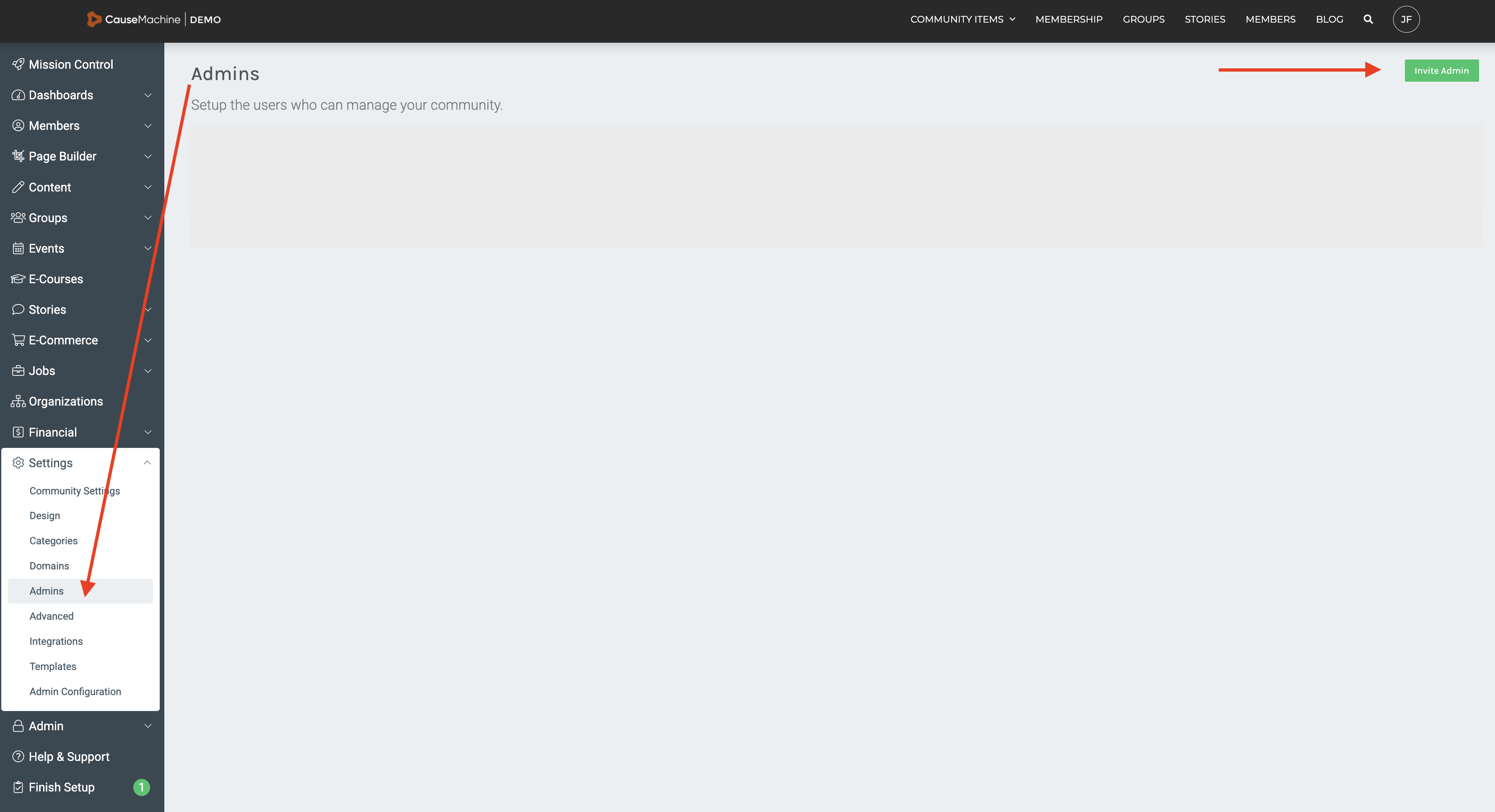 7. "Invite Collaborators" links to the "Admins" page found under Settings
